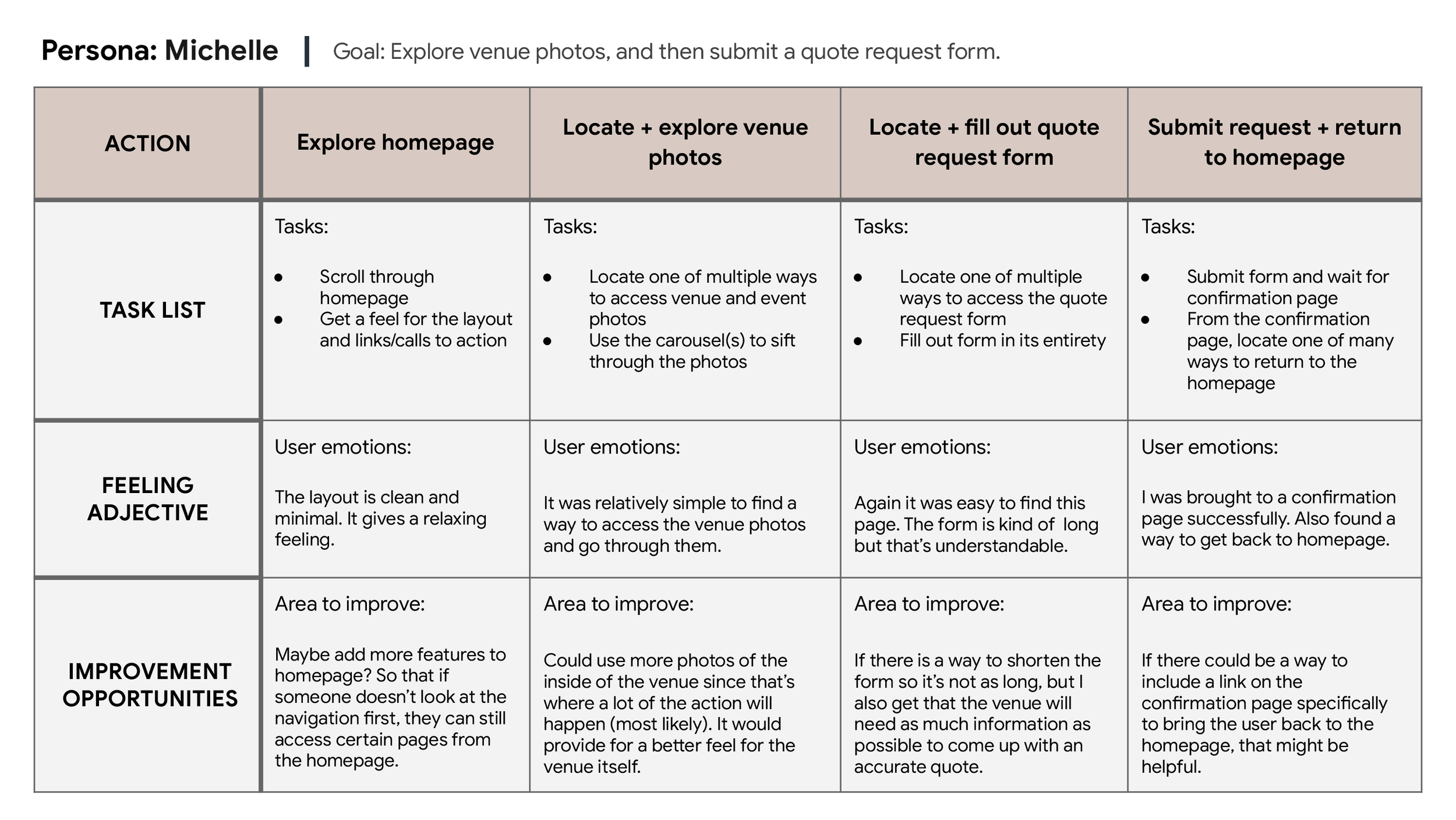 Goals: I’d like to figure out what specific difficulties users encounter when they try to complete the core tasks that come with using the website to obtain a quote for a specific event (in this case, a wedding), and realistically solve those issues.